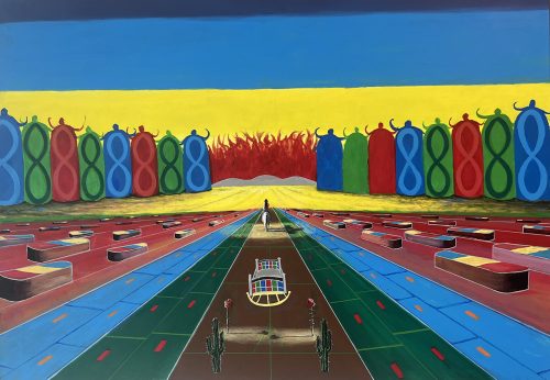The red, green, and blue vertical blocks—resembling buildings or skyscrapers—are not urban symbols per se, but rather metaphoric representations of vitality in nature: forests, trees, and ecosystems. These hues refer to the three primary colors in physics. Each bears the figure eight, which, when placed horizontally, becomes the symbol for infinity—signifying the unending cycle of reproduction and continuation of life.